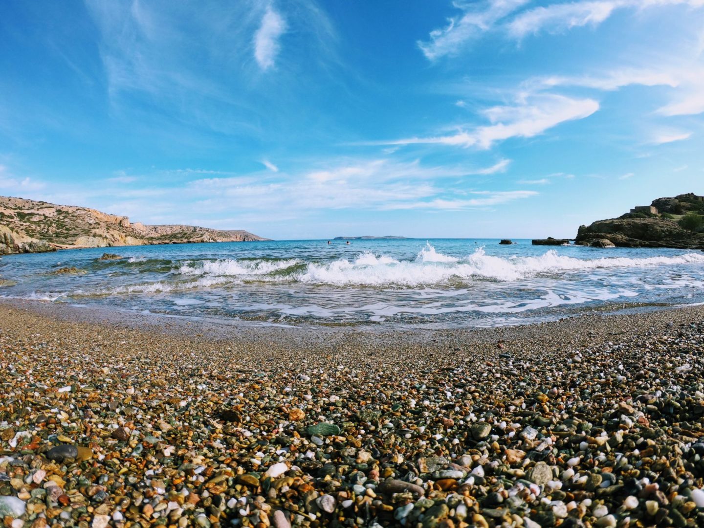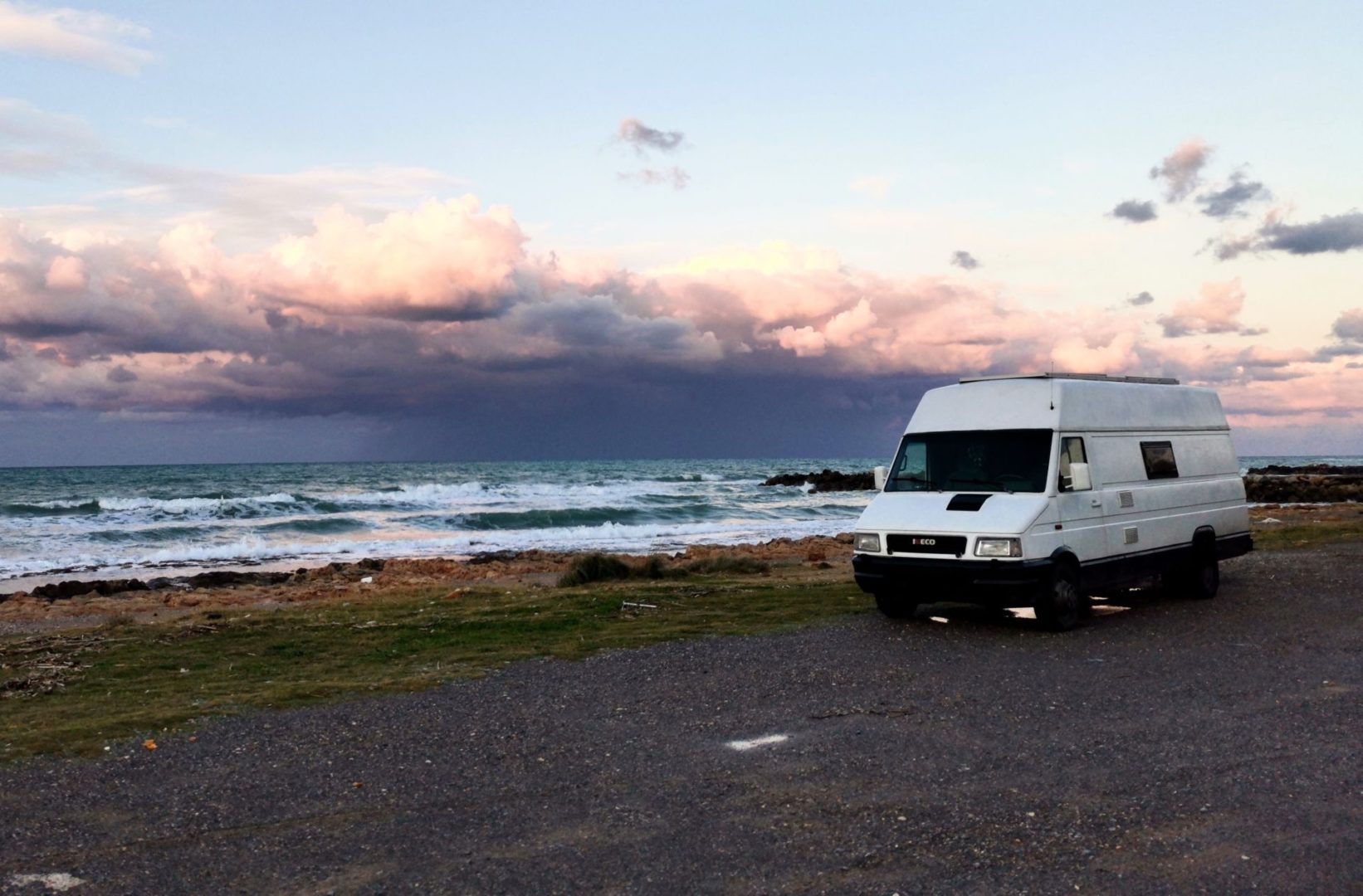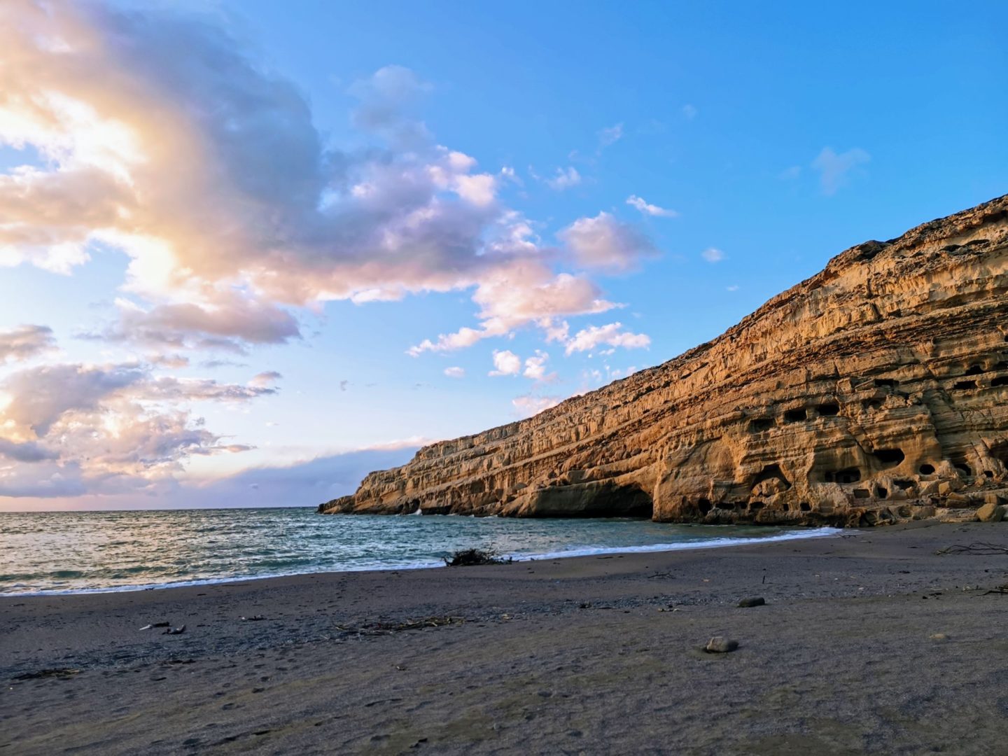 Přejeli jsme na pláž Matala, která je známá svýma jeskyněma vytesanýma do pískovcové skály. V 60. a 70. letech tam bydleli hippies! Přes noc jsme stáli na parkovišti u pláže pěkně čelem k moři. Což ale byla chyba. Brutálně foukalo, takže se nám přes noc pod kapotu dostalo strašně moc písku a my se tím houpáním dodávkou ani nevyspali.