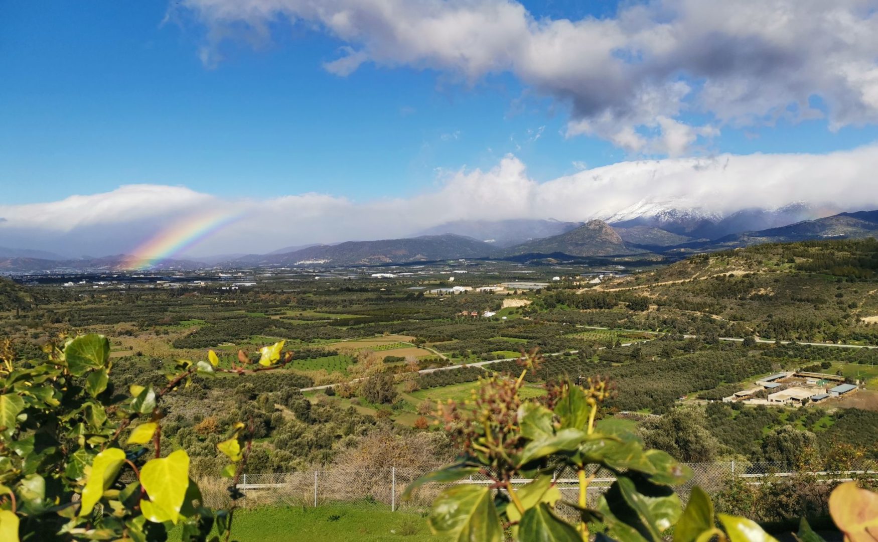 Předpověď počasí slibovala, že to následujících pár dní bude lepší. Dojeli jsme k vykopávkám pevnosti Phaistos, jedné z minojských památek na Krétě. Z dálky to nevypadalo zle, ale dovnitř se nám moc nechtělo. Užívali jsme si výhledů z tohodle kopce na protější zasněžený vrcholky a duhu, protože nad náma sice nepršlo, ale kousek od nás ano.