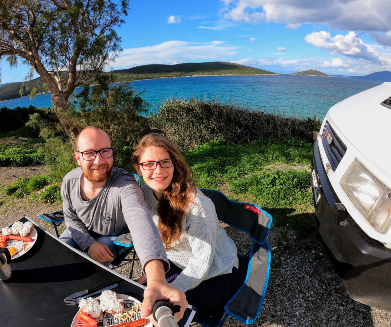 Do vánočního rána jsme se pak probrali zase pěkně na pláži a do moc hezkého počasí, že nám to i dovolilo si dát snídani pěkně venku. Po menším nákupu na svátky jsme zamířili pomalu, ale jistě, zas zpět k Chalkidě. Ke štědrovečerní večeři jsme si stylově opekli párky na ohni na jedné zaprděné pláži, kde ten večer projel jen asi jeden místňák a ještě nám zatroubil na pozdrav!