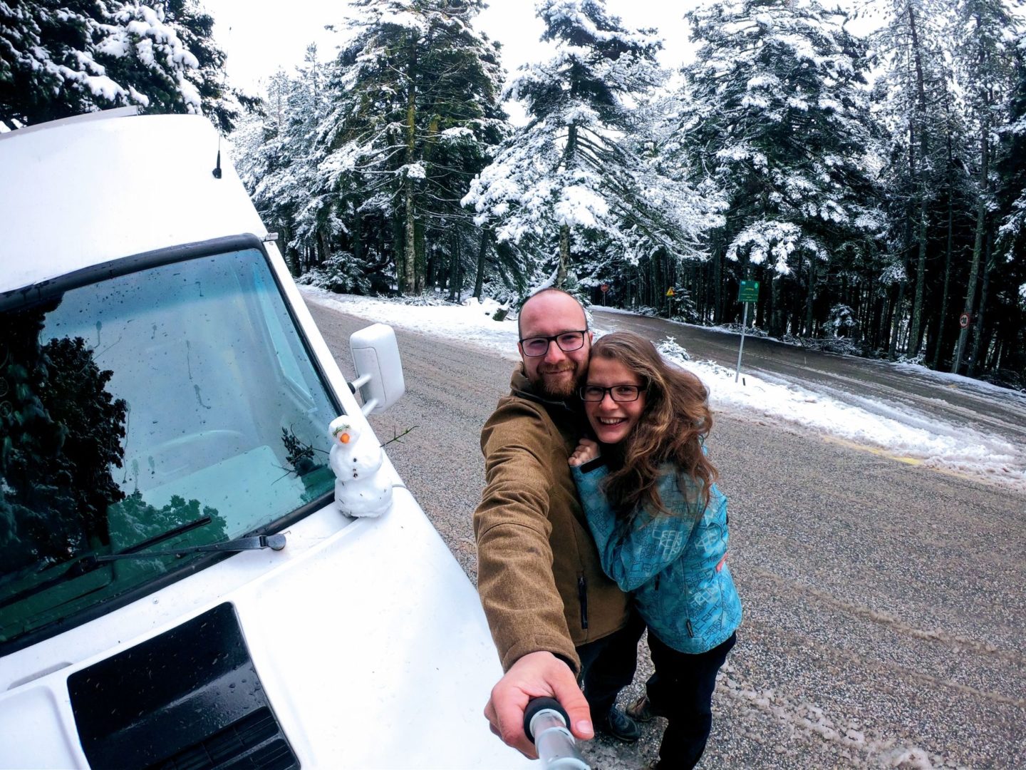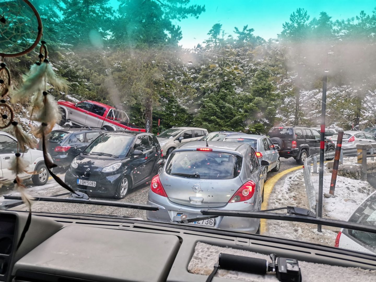 Ten samý nápad mělo i spoustu obyvatel města a tak jsme nahoru jeli v koloně. Fakt jsme se bavili. Měli jsme bezkonkurenčně největší auto, ale stejně to vypadlo, že si každý myslí, že má větší. Dělalo jim dost práce se vedle sebe vejít a nějak tam zaparkovat a když kolem nás začal být i trochu sníh, tak pár z nich pro jistotu i navlíkalo sněhový řetězy. My jsme se prodrali až skoro nahoru a když kolem nás nikdo nebyl, tak jsme to na širším úseku cesty otočili. Máme sice zimní pneumatiky, ale ona ta plná dodávka nejde tak snadno zastavit, když to začne klouzat.
