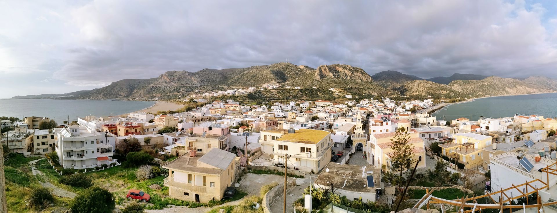 První věc, co jsme potřebovali zařídit, bylo sehnat vodu. Našli jsme jeden funkční (v zimě bývají zavřené) kohoutek u promenády na pláži a už se těšili, jak se večer osprchujeme. Stavili jsme se na jídlo v jednom místním podniku, kde nám zas po jídle přinesli domácí raki s desertem. Pokecali jsme s majitelem o politické situaci v Řecku a o cestování, lehce se přiopili a vybrkali ven, kde akorát zapadalo slunce. Vyběhli jsme si to na místní vyhlídku a kochali se panoramatem města, hor a moře.