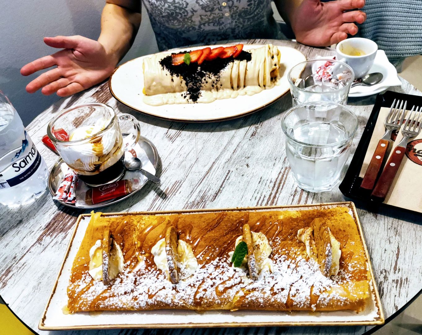 V Rethymnu je velká benátská pevnost, starý přístav a historické centrum s úzkými uličkami. Měli jsme štěstí na počasí a celou dobu nám krásně svítilo a skoro nefoukalo. Chtěli jsme si hlavně skočit někam do kavárničky na kafe. Zapadli jsme do jedné, co nás přivábila svou vůní a protože už to bylo chvíli od oběda, tak jsme si oba dali taky smoothie a velkou sladkou palačinku. Takhle přejedení jsme už dlouho nebyli! A byla to jedna z nejlepších palačinek, co jsem kdy měla!