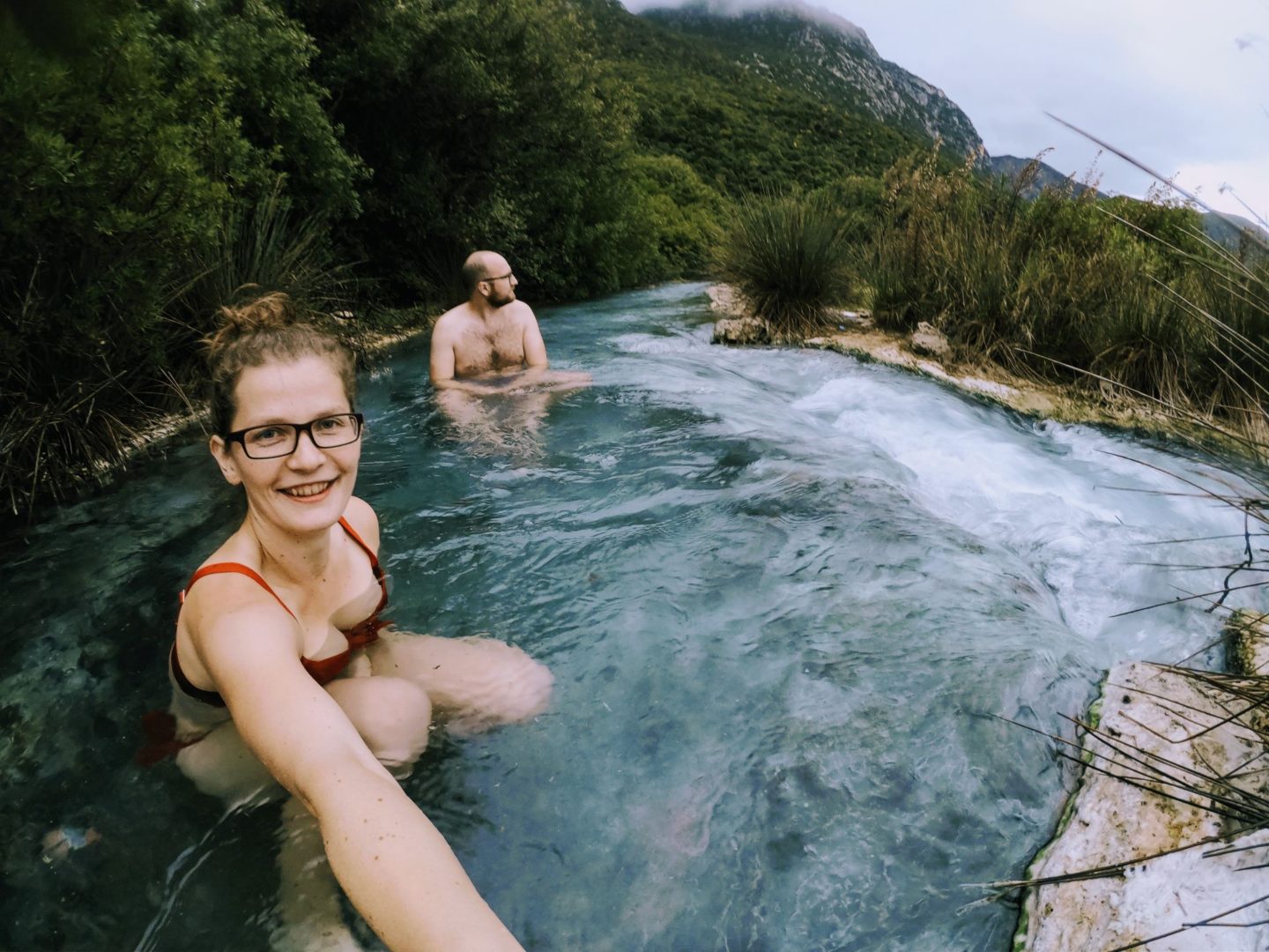 Zbylé kláštery jsme si prohlédli už jen od cesty. Udělali pár posledních fotek krajinek a popojeli zas dál. Další cíl byly Thermopyly. Chtěla jsem vidět na vlastní oči, kde probíhala ona slavná bitva. No, jako ve filmu to nevypadá. Ale nějaký náznak soutěsky tam byl. To co nás ale přitahovalo ještě trochu víc, byly termální prameny, které se tam stýkají v menší potůček. A ten je fakt teplý! Než stihne vychladnout, tak teče několik stovek metrů a všude se do toho dá vlézt a relaxovat.