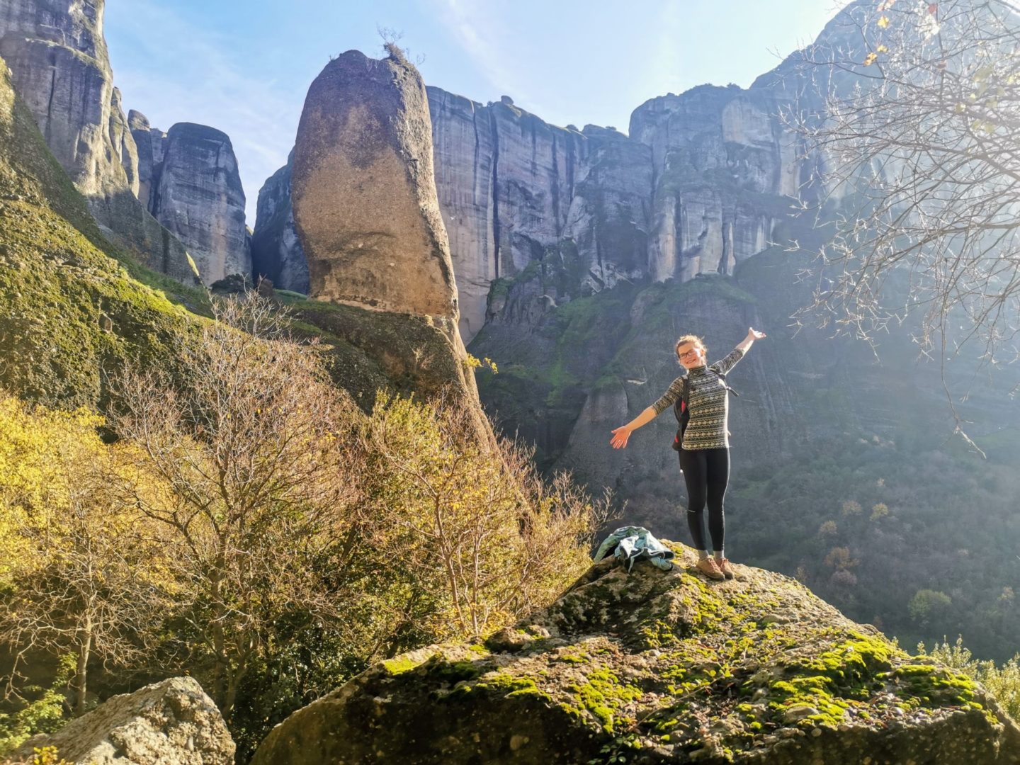 Další den k tomu i svítilo a páč Leo se teď nemůže hnout od práce, vydala jsem se okolí prozkoumávat sama. Z městečka Kastraki mě to vedlo do skal. Říkala jsem si, že to nějak projdu...no, ne všechny cesty vedou skrz mezi skálami. Při obcházení jednoho masivu jsem potkala pár milých lidí - australský pár a jednoho Angličana a přidala jsem se k nim. Vylezli jsme na jednu vyhlídku, naobědvali se tam a pokecali. Byli moc milí a teď už jsem i oficiálně přátelé - na facebooku! :D